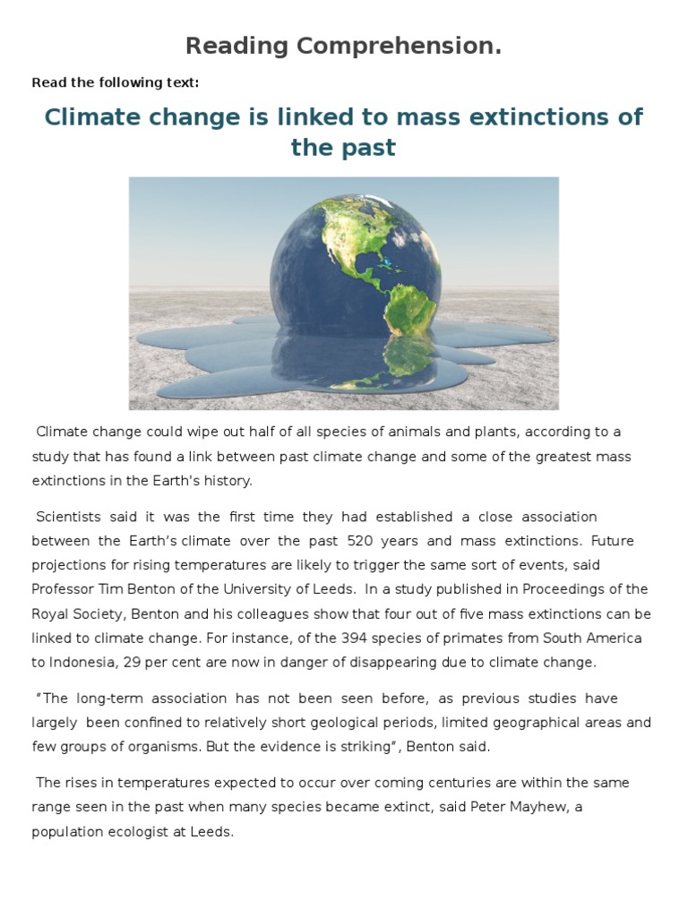 Read the following passage carefully climate change climate change will have serious implications as numerous adverse impacts are expected in terms of . The earth is about 4.5 billion years old, and during . Climate change is one of the most pressing issues of our time, and it's essential that we stay informed about the latest developments in this area. Global warming reading comprehension, worksheets, flashcards. There are also some grammar exercises.